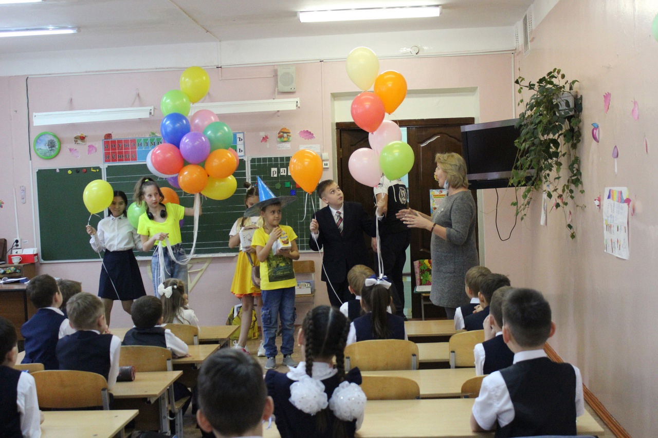 Чтобы первоклассники почувствовали эту разницу, ребята 6 «А» и 5 «Б» классов под руководством педагога - организатора Зубайдуллиной А.М подготовили и провели театрализованное представление, в котором приняли участие: ведущие (Козбан Матвей и Зинурова Нелли), Незнайка (Насыров Айдар), Кнопочка (Толпакова София), Двойка (Кошкина Виктория), которые провели интересные викторины и конкурсы. И нашим первоклассникам пришлось выполнить ряд заданий, чтобы Двойка не осталась у ребят навсегда. Каждый 1-ый класс подготовил песни и с удовольствием их пел с учителем музыки Зайцевой Т.Г.